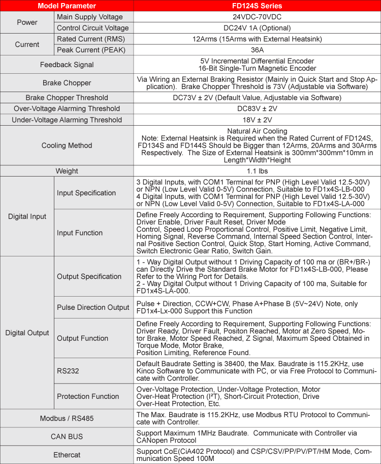 The PKS-FD124S-04 Servo System includes a 400 Watt SMC60S-0040-30MAK-3DSU Servo Motor or SMC60S-0040-30MBK-3DSU Servo Motor with brake, operated by the FD124S-LA-000 Servo Drive or FD124S-LB-000 Servo Drive (Brake version). These packages are ideal and provide easy start-ups, convenience, and performance. The Servo Motors included in these packages provide torque up to 3.81 Nm. The FD124S-LA-000 / FD124S-LB-000 Servo Drive is designed to switch dynamically among different control methods for more flexible operation and can operate position control mode either with pulse and direction inputs, 8 internal position points, or 8 internal speed points. Each system includes a 5m Motor Power Cable, 5m Encoder Cable and a Communication cable. If purchasing the option with a Brake then a 5m Brake Cable will be included as well.