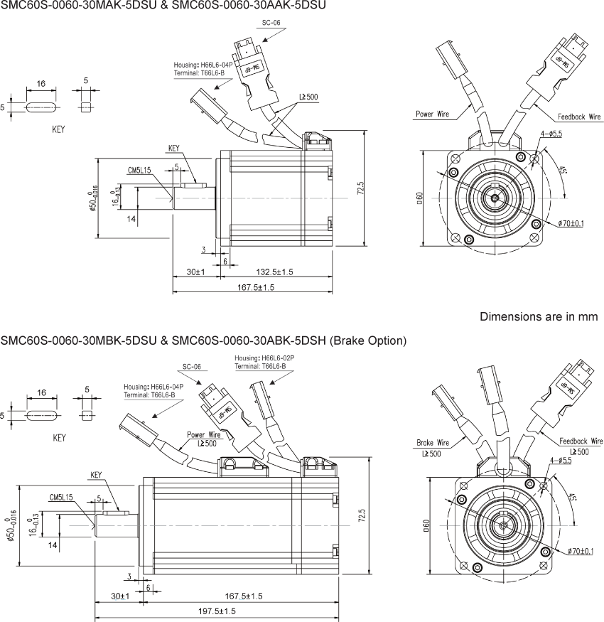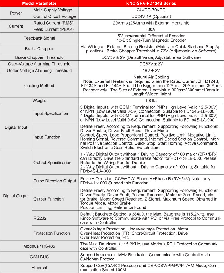 The PKS-FD134S-06 Servo System includes a 600 Watt Servo Motor or Servo Motor with brake, operated by the FD134S-LB-000 Servo Drive. These packages are ideal and provide easy start-ups, convenience, and performance. The Servo Motors included in these packages provide torque up to 5.73 Nm. The FD134S-LB-000 Servo Drive is designed to switch dynamically among different control methods for more flexible operation and can operate position control mode either with pulse and direction inputs, 8 internal position points, or 8 internal speed points. Each system includes a 5m Motor Power Cable, 5m Encoder Cable and a Communication cable. If purchasing the option with a Brake then a 5m Brake Cable will be included as well.