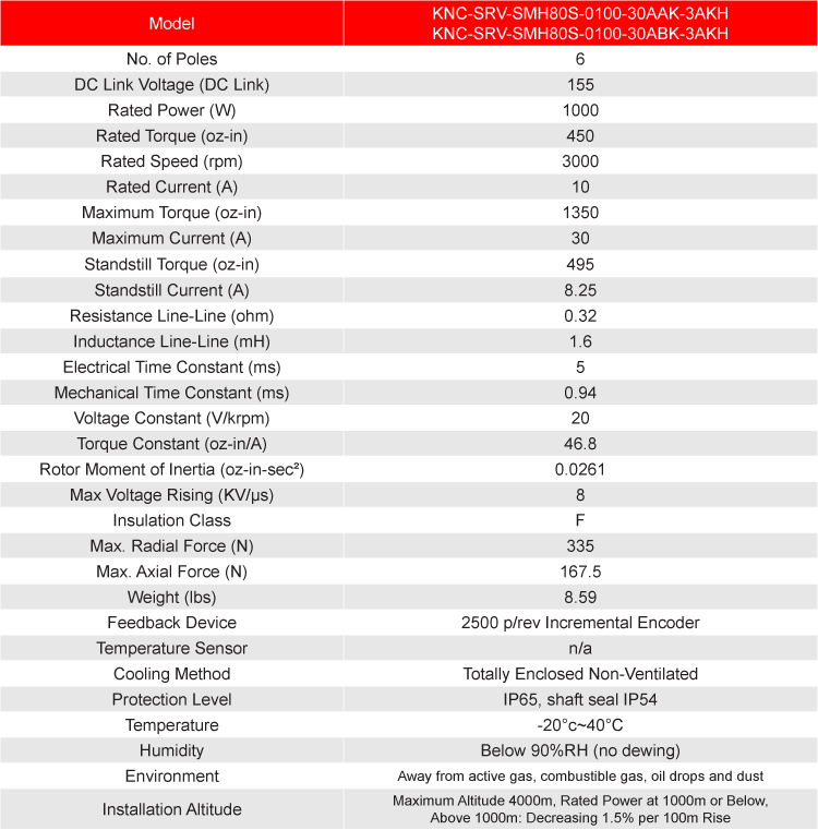 The KNC-PKS-FD332S-10-80S Servo System includes a 1000 Watt SMH80S-0100 AC Servo Motor operated by the FD332S-LA-000 Drive. These packages are ideal and provide easy start-ups, convenience, and performance. The Servo Motors included in these packages provide torque up to 3.18 Nm. The FD332S-LA-000 Drive offers current forward-feedback control, speed viewer, and inertia viewer; providing for improved response performance. Each system includes a 5m Motor Power Cable and a 5m Encoder Cable. If purchasing the option with a Brake then a 5m Brake Cable will be included as well.