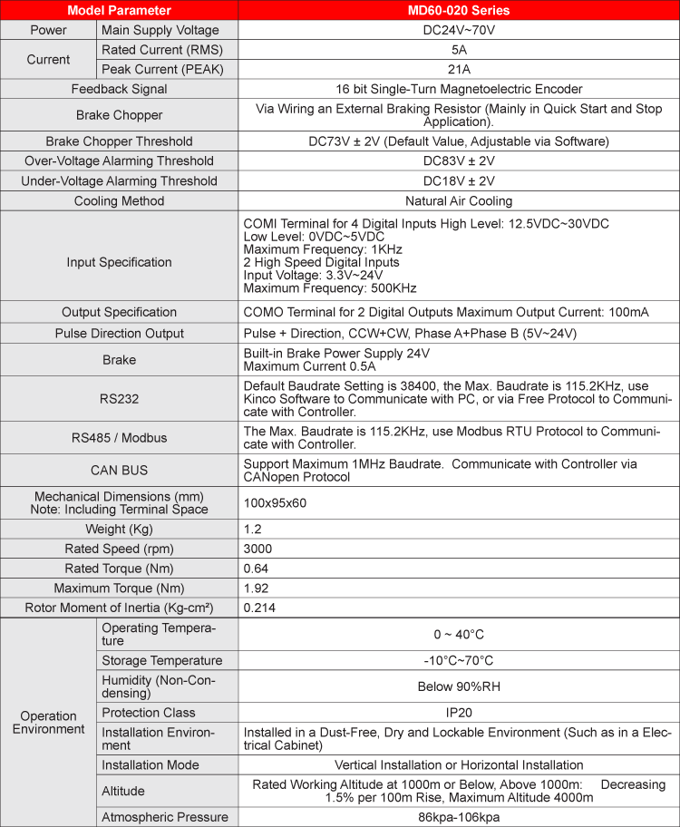 • Động cơ Servo DC tích hợp Bộ điều khiển 200W Kinco MD60-020-DMAK-CA-000